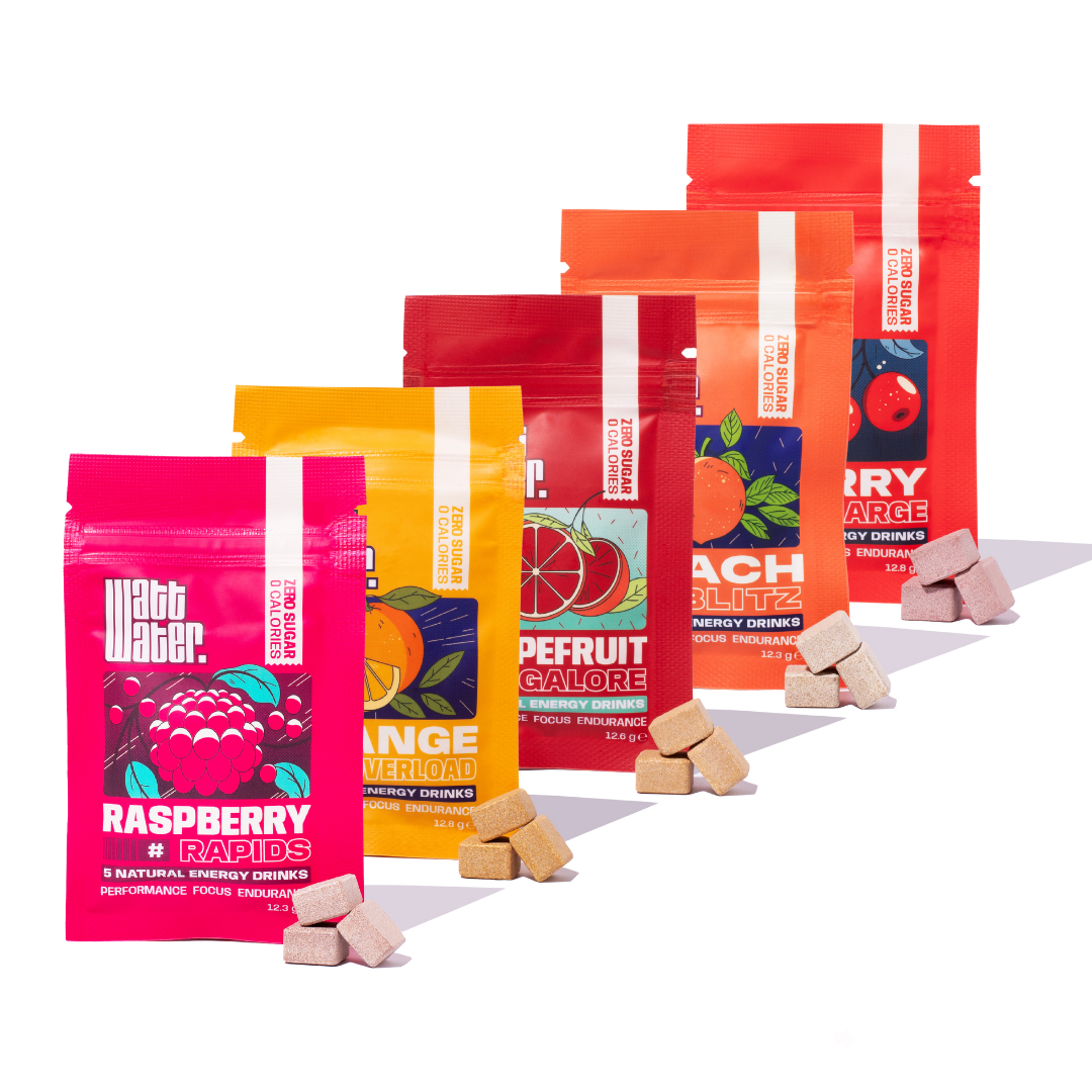 25 servings in packs of 5 delicious & invigorating Raspberry, Cherry, Orange, Grapefruit & Peach flavoured energy drinks with 80mg caffeine